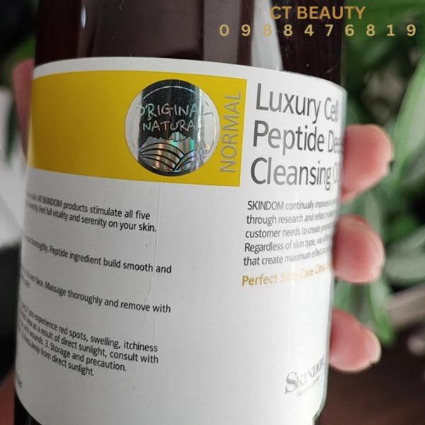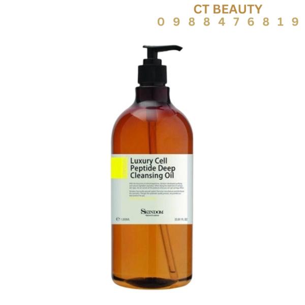 - Skindom LUXURY CELL PEPTIDE DEEP CLEANSING OIL 1000ml. Là một loại dầu tẩy trang có thành phần đặc biệt được thiết kế . Để loại bỏ sạch lớp trang điểm, bụi bẩn và dầu thừa trên da. Sản phẩm này còn chứa các peptide nuôi dưỡng da. Giúp tái tạo tế bào và cải thiện sức sống của da.