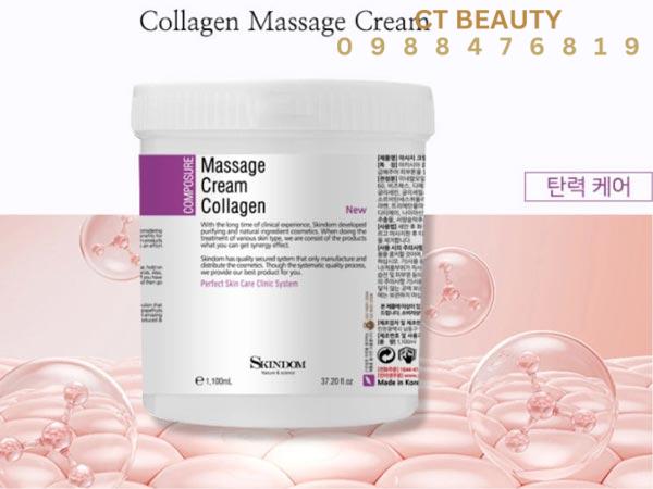 - Kem massage collagen Skindom với thành phần chủ đạo được chiết xuất từ collagen tự nhiên. Là thành phần quan trọng giúp cung cấp độ đàn hồi, độ săn chắc cho da.